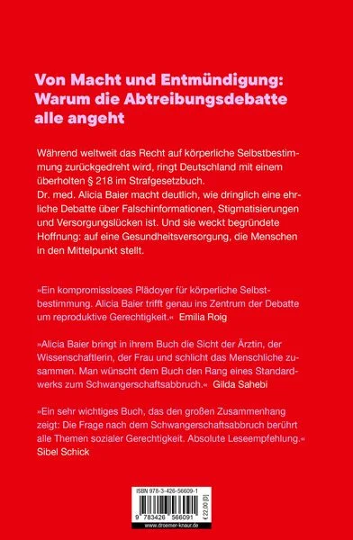Dabei wird klar: Die aktuelle rechtliche Regelung in Deutschland verursacht nicht nur große Probleme in der medizinischen Praxis, sondern folgt auch patriarchalen Mustern und ist ein Einfallstor für rechte Ideologien. Lücken im Medizinstudium, Bevormundung per Gesetz und Vorurteile statt ärztlicher Professionalität sind dabei nicht aus einem luftleeren Raum entstanden. Mit viel Empathie und großer Expertise zeigt Baier, warum dies eine Geschichte von Macht und Entmündigung ist. Und sie macht deutlich, was sich in Gesellschaft, Medizin und Politik ändern muss, damit gebärfähige Menschen selbst über ihre Körper bestimmen können. So wird klar: Das Thema geht uns alle an.