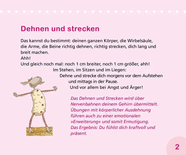 Nach sieben sehr erfolgreichen »kleinen Überlebensbüchern« und dem Kartenset »Ich schaf(f) das!« ist nun endlich eine Auswahl der beliebtesten Körperübungen von Claudia Croos-Müller als immerwährender Aufsteller lieferbar. Die Autorin präsentiert darin Übungen wie »Schulterwurf«, »Hand aufs Herz« und »Daumen hoch« für alle Lebenslagen. Auf dem ersten Blatt wird der Übungstitel zusammen mit der kongenialen Schaf-Illustration von Kai Pannen abgebildet. Auf einem zweiten Blatt folgt die Übungsanleitung.»Hand aufs Herz« ergänzt bestens die erfolgreichen »Überlebensbücher« und eignet sich hervorragend als Geschenk – für sich selbst und für andere.