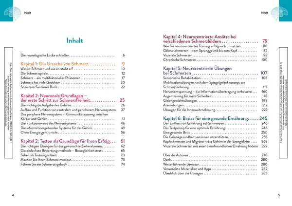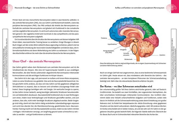 Jeder zweite Deutsche hatte in den letzten zwölf Monaten Gelenkschmerzen, 15 Millionen leiden an länger andauernden oder wiederkehrenden Beschwerden und 28 Prozent haben chronische Schmerzen. Doch die wenigsten wissen, dass Schmerz im Gehirn entsteht. Um optimale und nachhaltige Erfolge bei der Behandlung zu erzielen, ist es deshalb essenziell, den Fokus auf das Nervensystem zu legen. Neurozentriertes Training - vorwiegend bekannt aus dem Spitzensport - ist dafür ideal geeignet, da es gezielt den Schmerz-Output des Gehirns reduziert. Die Neuroathletiktrainer Lisa und Andreas Könings erklären, wie Wahrnehmung und Entstehung von Schmerz mit dem Nervensystem verbunden sind und wie sich Betroffene selbst helfen können. Über 80 detaillierte und bebilderte Übungen aus dem neurozentrierten Training sind dabei unterschiedlichen Beschwerdebildern zugeordnet: von Gelenkschmerzen in Hüfte, Knie oder Schulter über Kopf-, Nacken- und Rückenschmerzen bis zu viszeralen und chronischen Schmerzen. Die Autoren zeigen außerdem, wie die Ernährung das Gehirn und somit auch Schmerzen beeinflusst und welche Nahrungsmittel für mehr Energie und gesunde Gelenke, Muskeln, Faszien und Bänder sorgen. Dieser ganzheitliche Ansatz ermöglicht es jedem, aus der Schmerzspirale auszubrechen und die eigene Lebensqualität zu verbessern.