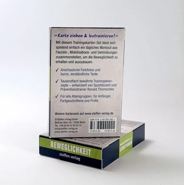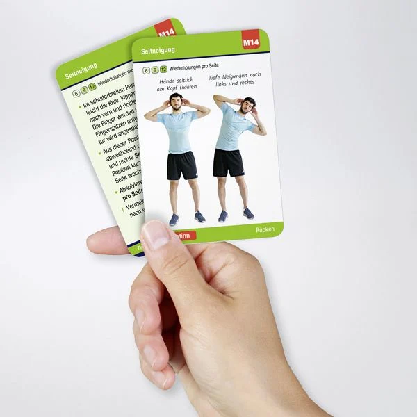 Die Trainingskarten „Beweglichkeit“ eignen sich hervorragend zum Mitnehmen. Machen Sie damit zuhause Sport oder trainieren Sie damit jederzeit, wo Sie möchten: unterwegs, im Büro, in der Natur, allein oder mit Freunden.
