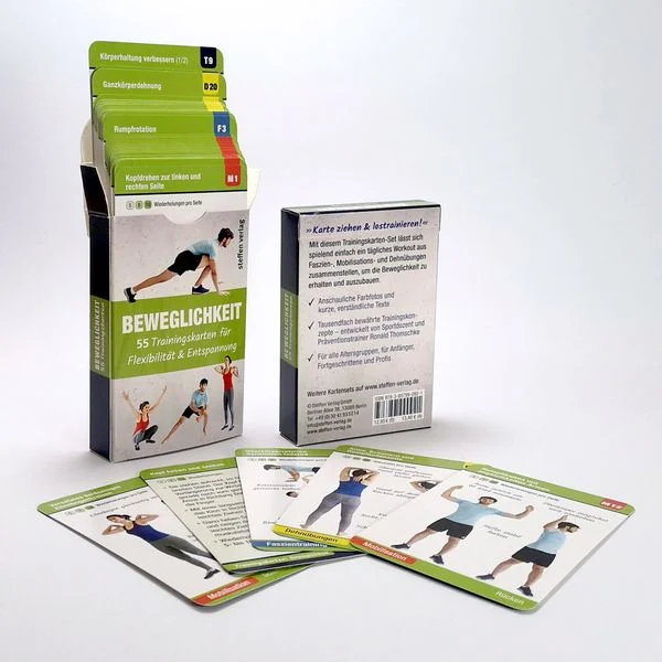 Beweglichkeit ist ein Muss im Alltag, sie entscheidet, ob Tätigkeiten daheim, bei der Arbeit oder in der Freizeit leicht oder mühsam zu bewältigen sind. Mit dem Trainingskarten-Set „Beweglichkeit“ lässt sich spielend einfach ein tägliches Workout zusammenstellen, das zu mehr Flexibilität und Muskelentspannung führt sowie muskulären Dysbalancen entgegenwirkt. Bereits wenige Minuten und Übungen am Tag, z.B. aus dem Bereich Stretching, helfen, die Muskulatur geschmeidig und die Gelenke beweglich zu halten.