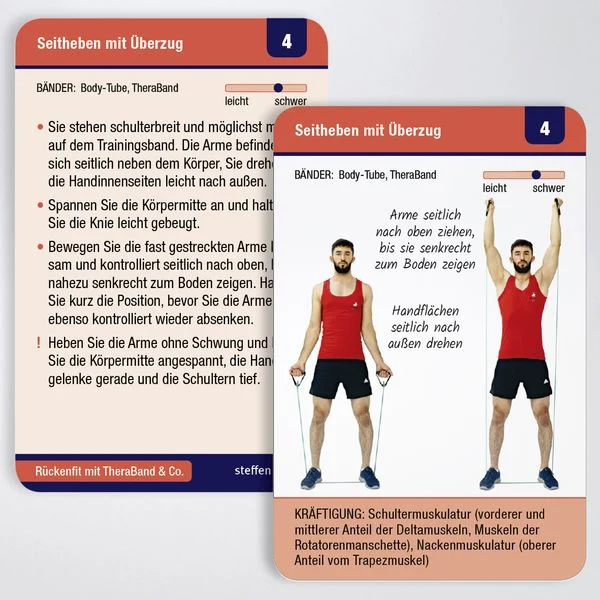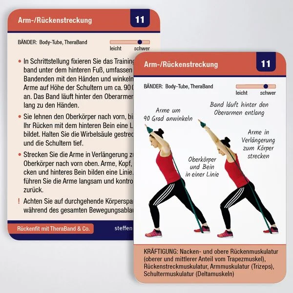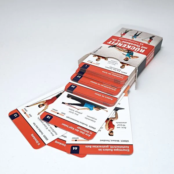 Mit diesem Trainingskarten-Set lassen sich spielend einfach tägliche Rückenübungen mit TheraBand & Co zusammenstellen, die neben der Rückenmuskulatur auch den gesamten Körper stärken . Anfänger und Fortgeschrittene finden gleichermaßen Übungen im Set; zudem lassen sich die Übungen an das aktuelle Trainingsniveau anpassen. So wird Rückentraining leicht gemacht!